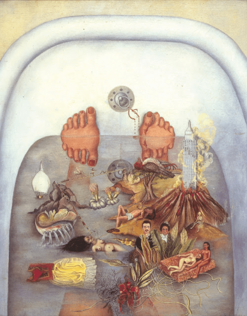 Second, a brief meditation will sharpen your mind, allowing you to become more capable of observing your mind for what it is: the water that cycles in a river journeying from the sky to the night sea and round again. The river, or journey to the sea, is not shaped by what flows through it, but by the places in which it is allowed to erode. Meditation places strategic levees to make this journey smoother and somewhat less chaotic. The significance of water to this piece could contain yet another meaning; it could also be indicative of the childhood memories many of us may harbour, and the meandering necessary to reach the depths of our diverse childhoods (which might even overlap with memories in the tub). Or, yet another message could be adrift in the water. Frida’s legs are submerged, with only her toes poking out, reflected in the still water; could this represent the stillness she achieved by having this dialogue by using painting as her mode of communication? Her bath seems to show her own reality, her own thoughts, and her own demons, for what they truly represent.