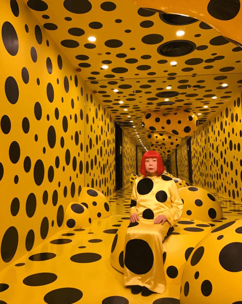 The polka dots are an extension of what exists within Yayoi Kusama. Normally invisible, here such inner workings have been made visible. Though this is a waxwork figure of Yayoi Kusama at Madame Tussauds, Hong Kong, she is often clad in dotted dresses. (photograph: VCG/Getty Images)